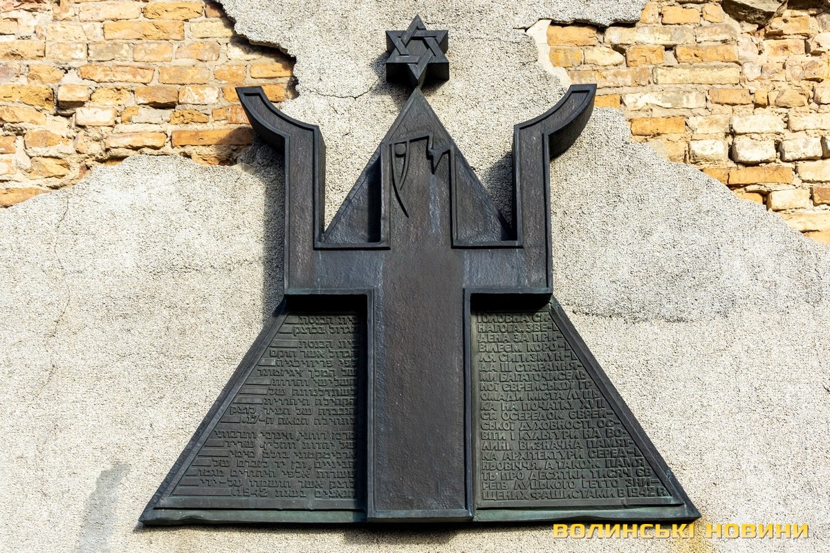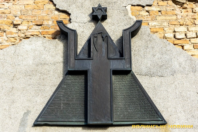 Двомовна (українською та івритом) дошка на честь луцької синагоги та в пам’ять про євреїв, знищених у луцькому гетто.