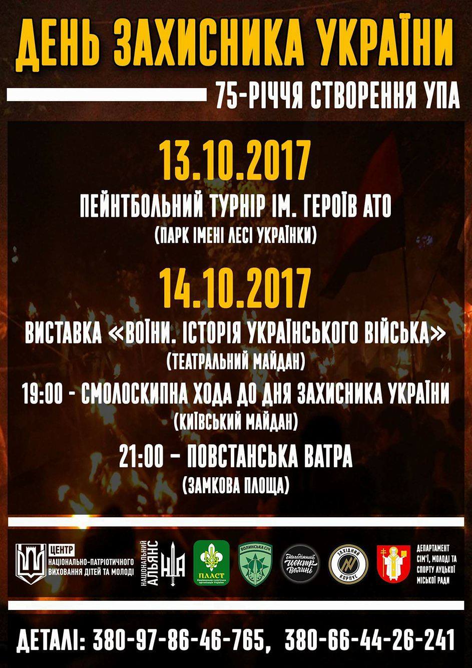 13-14 жовтня КЗ «Центр національно-патріотичного виховання дітей та молоді у місті Луцьк» спільно з громадськими організаціями Луцька проводять ряд заходів для відзначення Дня Захисника України та 75-ої річниці з Дня створення УПА.