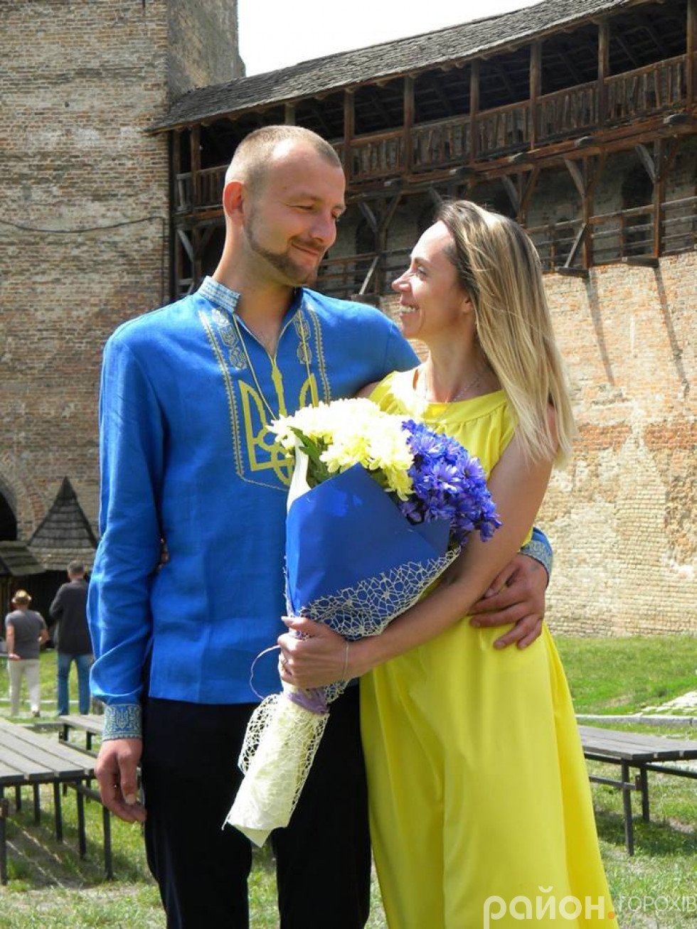 Жовте плаття нареченої та синя вишиванка військового ніби сяяли у проміннях сонця на строгому середньовічному тлі замку Любарта.