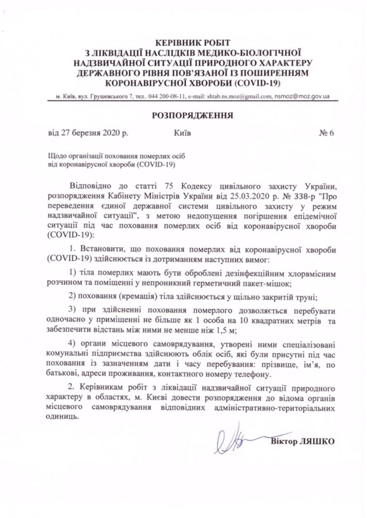 Розпорядженням Віктора Ляшка від 27 березня затверджено такий алгоритм поховання людини, яка хворіла, або мала підозру на коронавірус, і померла в лікарні: