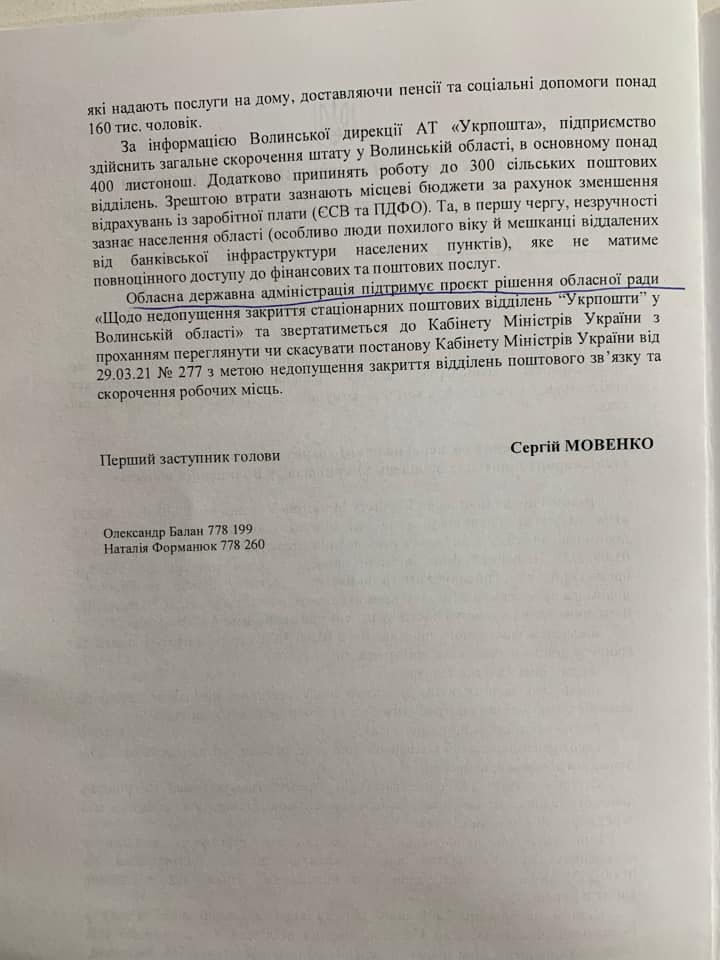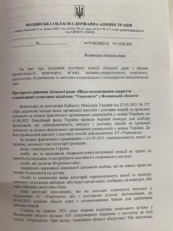 Згідно з інформацією Волинської дирекції АТ «Укрпошта», підприємство здійснить загальне скорочення штату у Волинській області, загалом - це понад 400 листонош. Додатково припинять роботу до 300 сільських поштових відділень. Зрештою втрати зазнають місцеві бюджети за рахунок зменшення відрахувань із заробітної плати (ЄСВ та ПДФО). Але першочергово незручності зазнає населення області (особливо люди похилого віку й мешканці віддалених від банківської інфраструктури населених пунктів), яке не має повноцінного доступу до фінансових і поштових послуг», - йдеться у відповіді ОДА й вказується, що облдержадміністрація підтримує звернення депутатів.До слова, в документі також ідеться про те, що до 1 вересня Пенсійний фонд проведе перший конкурс для відбору організацій, які здійснюватимуть виплату і доставку пенсій та грошової допомоги за місцем фактичного проживання одержувачів.