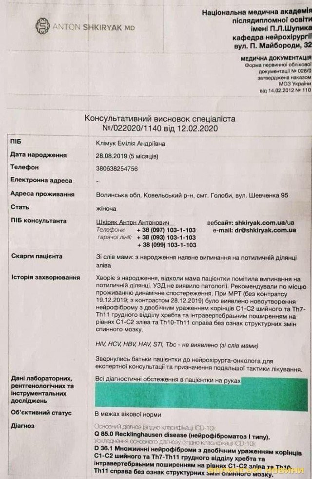Нагадаємо, раніше Інформаційне агенство Волинські Новини повідомляло про те, що лікарі виявили у маленької Емілії Клімук об'ємні новоутворення (пухлини) в ділянці потилиці зліва, а також пухлинні утворення на рівні С1- С2 (дуже великий ризик пошкодження корінців) шийного та Th 7 - Th11 грудного відділу хребта. Їй поставили діагноз «Нейрофіброматоз І типу». Про це свідчать результати обстеження із заключенням лікарів, які надали батьки дівчинки.Оскільки Емілія зростає у сім’ї, де щиро вірять у Бога, тому мама і тато дівчинки переконані – після операції за кордоном їхній маленькій «посміхайці» все вдасться і незабаром дитина буде абсолютно здоровою.«А ви зауважували, що діти часто посміхаються? Що вони роблять це безліч разів протягом дня? Діти вміють радіти життю, приємним дрібницям і відкриттям, якими наповнений кожен їхній день. Діти посміхаються до цього світу і весь світ відповідає їм взаємністю. Мудрий Соломон писав: «Радісне серце добре лікує, а пригноблений дух сушить кості». Ось який секрет ліків дарують нам діти - вірити і перемагати все з усмішкою та хорошим настроєм. Проти такої сили важко встояти і зламати дух, як хворобам, так і обставинам життя. Для нас прикладом у цьому є донечка, яка попри пухлини, біль чи дискомфорт, який вона може відчувати, посміхається і хоче жити. Вона бореться з хворобою з бойовим духом і вірою, що Бог поруч. Її щира посмішка і чисте серце лікує кожного з нас. І хоча попереду ще стільки випробувань, я вірю, що це дитя змінить світ своєю посмішкою, що її посмішка буде лікувати кожного, хто цього потребує», - каже мама Емілії Марія Клімук.
