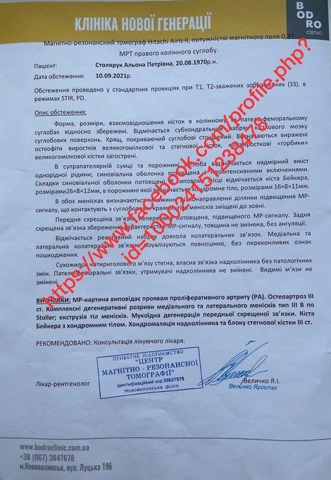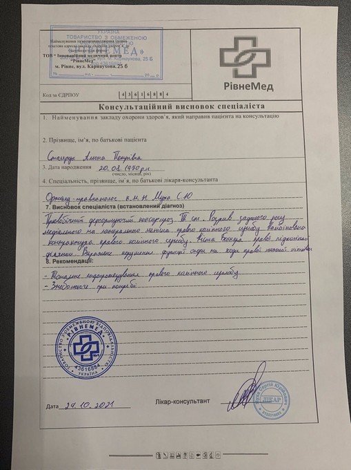 Володимирчанка хворіє з 2004 року ревматоїдним артритом. Її діагноз – правобічний деформуючий коксартроз третього ступеню; розрив заднього рогу медіального та латеріального менісків правого колінного суглобу.