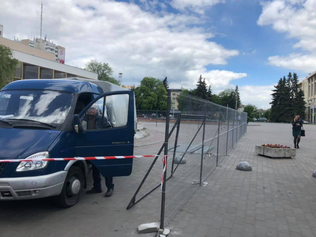 "Територія робіт обгороджена прозорим парканом" аби на перехожих потрапляли шматки цегли, хмари пилу, уламки старого фонтану, бризки від бетону і т.д.