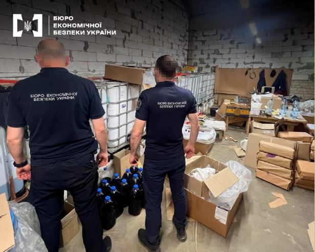 Детективи БЕБ провели обшуки на території незаконного виробництва та вилучили фасовану продукцію об’ємом понад 15 тисяч літрів, 5,5 тонни спирту та 1 тонну готової рідини для розливу тощо.