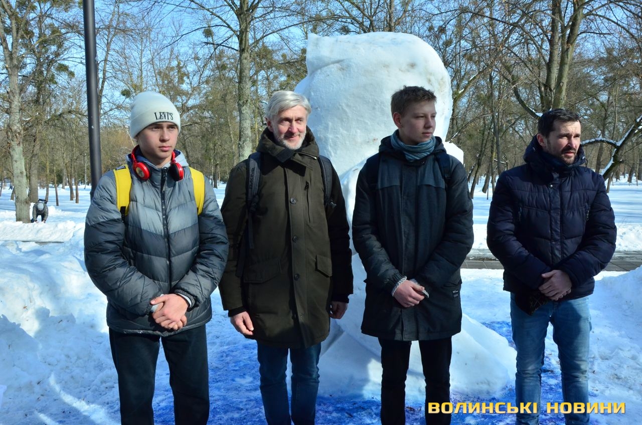 Над арт-об’єктом вони спільно з куратором, викладачем кафедри образотворчого мистецтва та дизайну Іваном Тарасюком безперервно працювали протягом п’яти годин.«Моя команда – студенти другого, четвертого та п’ятого курсів. Спершу ми планували створити постать Лесі Українки у зв’язку із 150-річчям з дня народження письменниці. Але погода внесла свої корективи. Минулого тижня куби снігу були погано збиті, адже тримався мороз і сніг просто не ліпився. Тому ми перенесли все на цей тиждень, і коли розкрили куб, то побачили, що всередині – пустота. В процесі ми змінили задум і в нас вийшла не постать Лесі, а її постаті. Це Леся в інших іпостасях. У її творах багато різних героїв, і сама авторка була дуже багатогранною. Наша робота складається з двох скульптур, які торкаються одне одного спинами. Дехто тут бачить чоловіка і жінку, інші – дві жінки, як різні сторони Лесі», – зазначила Тетяна Прокопович із кафедри образотворчого мистецтва та дизайну факультету культури і мистецтв ВНУ імені Лесі Українки.«Лесина постать» створена з монолітного блоку, завдяки чому скульптура зберігатиме цілісність довше.Як поділилися митці з Луцького національного технічного університету, їхній «Вартовий Лучеська» протягом століть оберігає в темну пору доби спокійний сон містян.