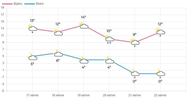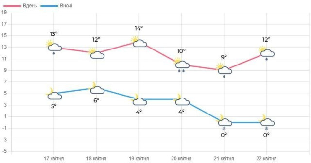 21 квітня буде хмарно з проясненнями. Вночі невеликий дощ. Вдень без істотних опадів. Вітер північно-східний, 7-12 м/с. Температура вночі становитиме 0-5° тепла, на поверхні ґрунту заморозки 0-3°, вдень – 11-16° тепла.