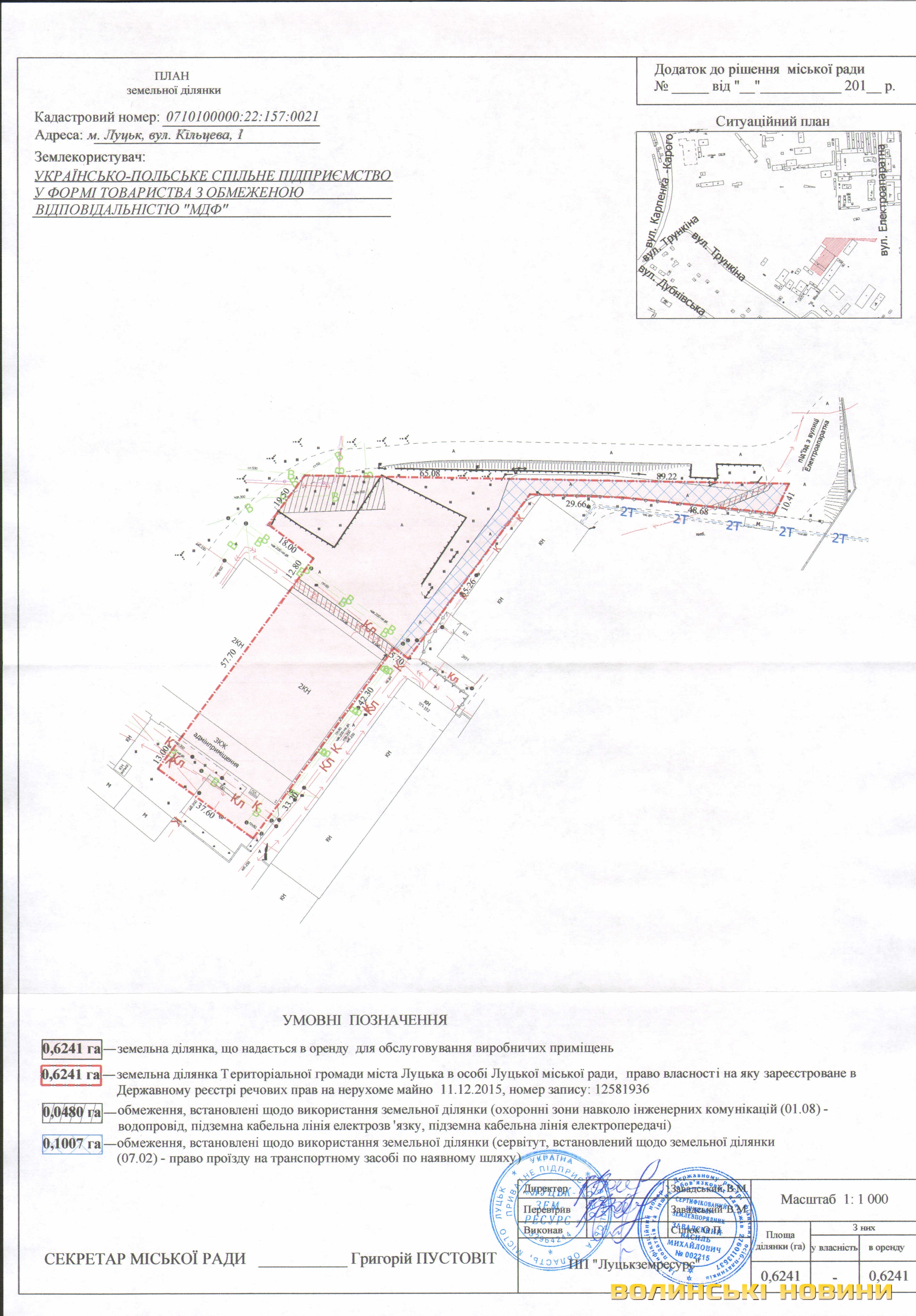 Нагадаємо, згідно із рішення міської ради від 25 червня 2015-го року, українсько-польське спільне підприємство у формі товариства з обмеженою відповідальністю «МДФ» подало клопотання до щодо надання згоди на поділ орендованої земельної ділянки на вулиці Кільцевій, на підставі договору оренди землі, укладеного між Луцькою міською радою та підприємством. Внаслідок цього, право власності на незавершений каркас частини виробничого корпусу (дільниця передпродажної підготовки автомобілів) на вулиці Кільцевій, 1 перейшло від УПСП ТЗОВ «МДФ» до ПП «Транс-Атлас».