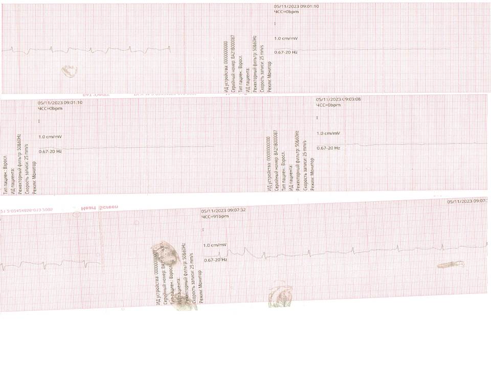 Спеціалісти бригади відділу медицини катастроф прибули на місце виклику через сім хвилин. Під час огляду пацієнта було констатовано раптову смерть і негайно підключено монітор, розпочато реанімаційні заходи.