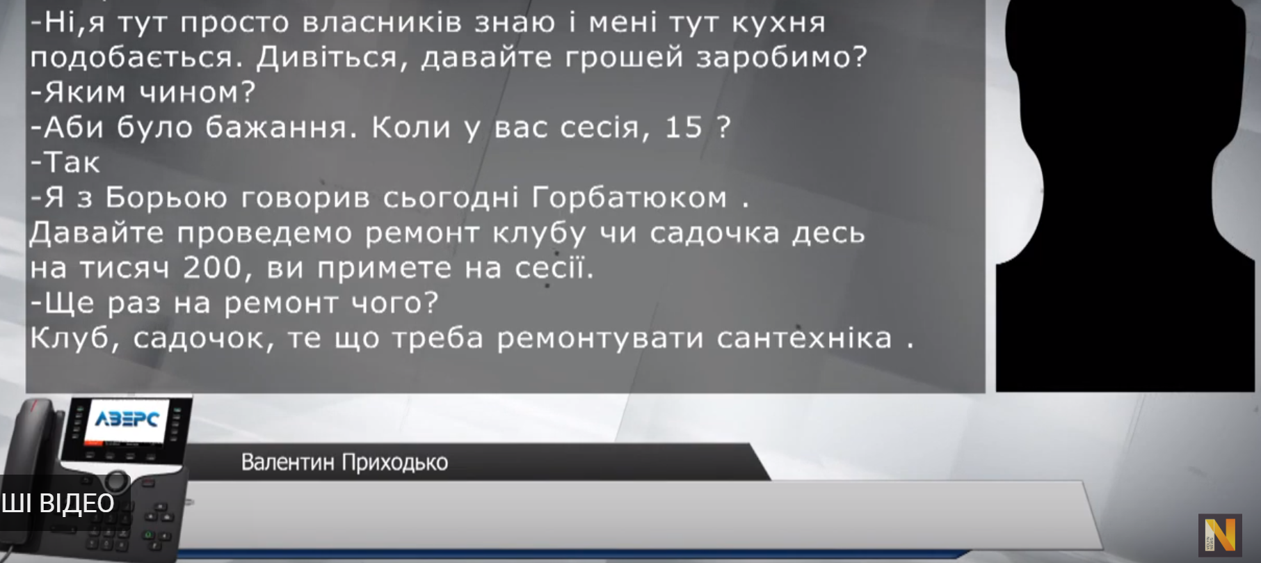 - К: Я з Борьою говорив сьогодні, Горбатюком. Давайте проведемо ремонт клубу чи садочка десь на тисяч 200, ви приймете на сесії.
