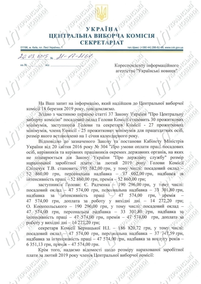 Зарплата членів Центральної виборчої комісії (ЦВК), які займаються організацією проведення виборів президента 31 березня, за лютий склала від 176,2 тис. грн до 213,6 тис. грн, що вище в середньому в 7 разів, ніж оклад самого Президента України.