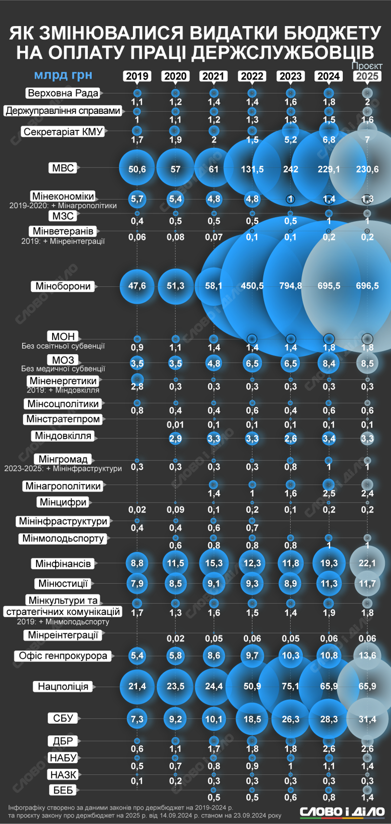 На зарплати службовців у Міноборони у 2019 році виділили 47,6 млрд гривень, у 2020 році – 51,3 млрд, у 2021 році – 58,1 млрд, у 2022 році – 450,5 млрд, у 2023 році – 794,8 млрд, в 2024 році – 695,6 млрд. У проєкті бюджету-2025 передбачено 696,5 млрд.