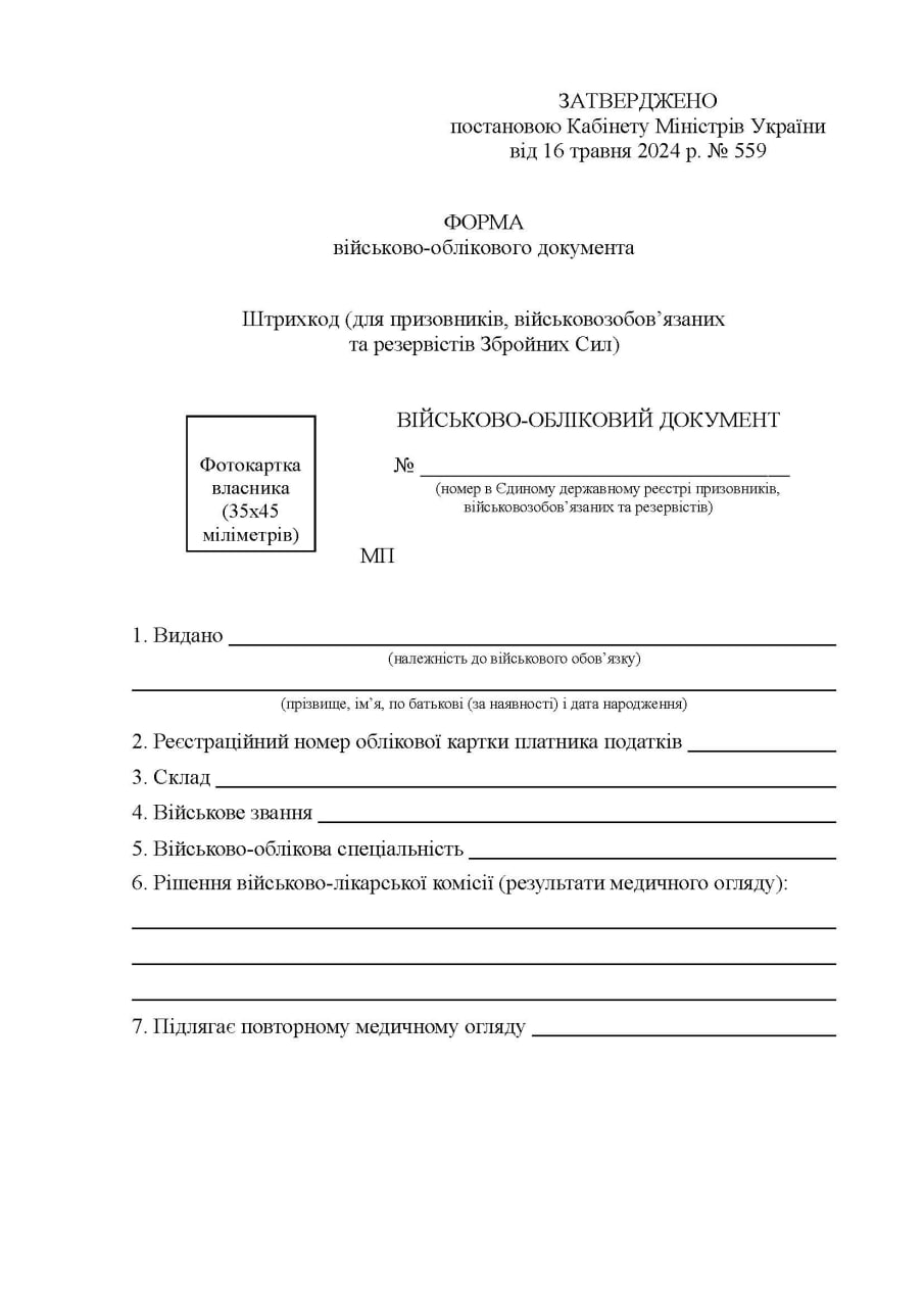 «Відповідно до нового порядку, військово-обліковий документ є документом, що визначає належність його власника до виконання військового обов’язку, який оформляється (створюється) та видається громадянину України, який є призовником, військовозобов’язаним або резервістом, у тому числі, якщо він був виключений з військового обліку призовників, військовозобов’язаних та резервістів відповідно до пунктів 3 і 4 ч. 6 статті 37 Закону «Про військовий обов’язок і військову службу» та не отримував такий документ до набрання чинності цією постановою Кабміну від 16 травня №559», – зазначено в постанові Кабміну.