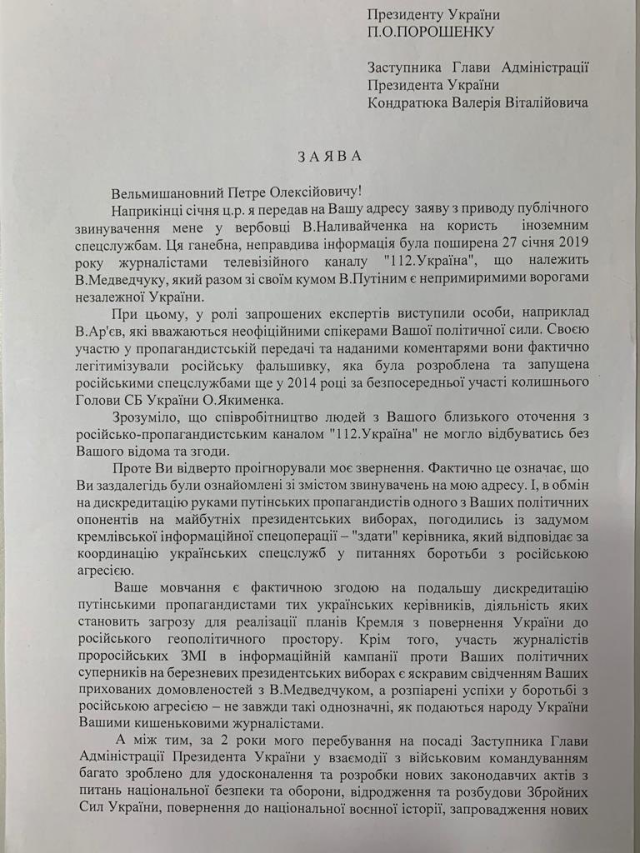 У розпорядження редакції потрапила заява генерал-лейтенанта Валерія Кондратюка на ім'я президента України Петра Порошенка, в якому пояснюються причини вимушені подачі в лютому цього року рапорти про відставку.