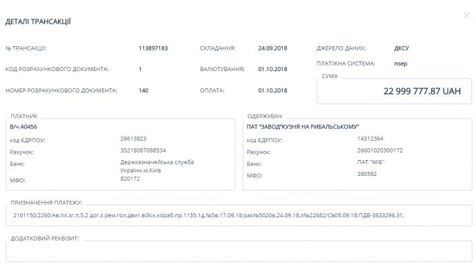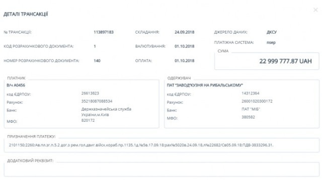 На порталі зазначено, що угода з «Кузнею» підписана у вересні 2018 року. Гроші перераховані військовою частиною А0456 військово-морських сил України.