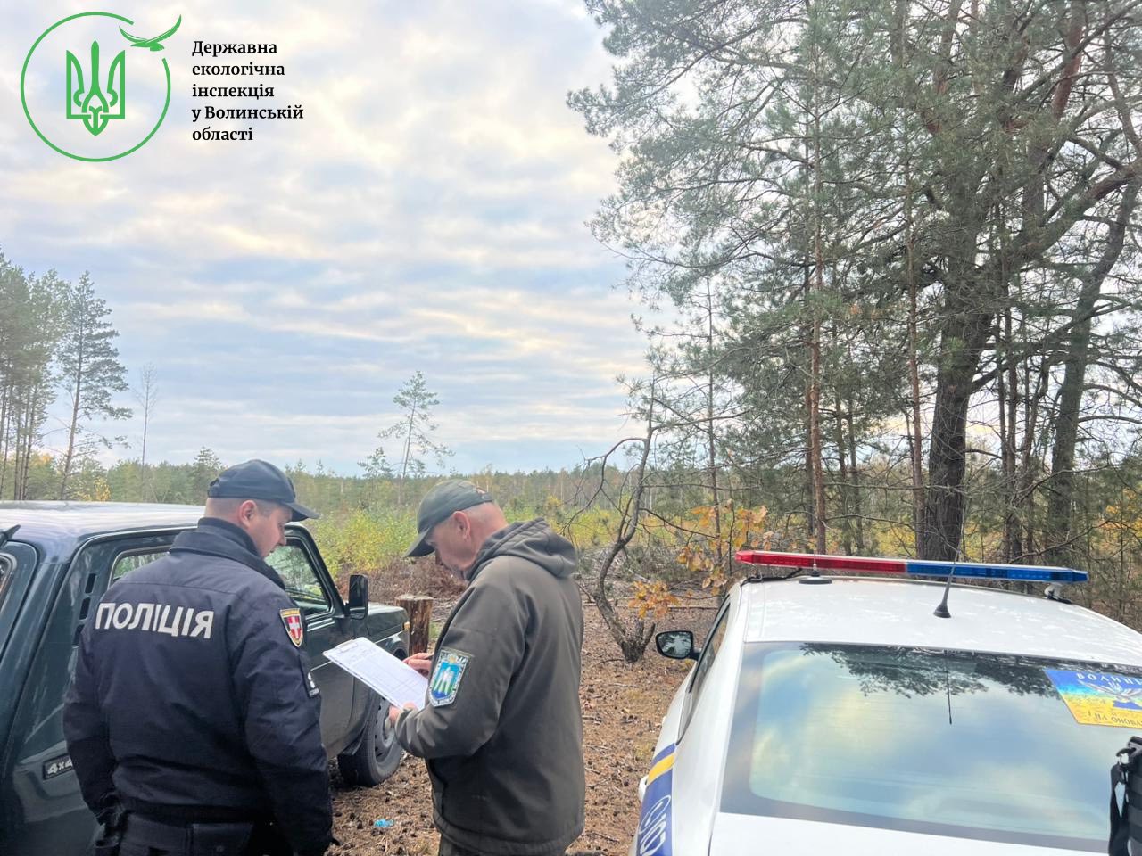 Під час проведення оглядів місця події спеціалістами Інспекції спільно з працівниками ГУНП у Волинській області було зафіксовано 1489 пнів зрубаних дерев порід сосна та береза.