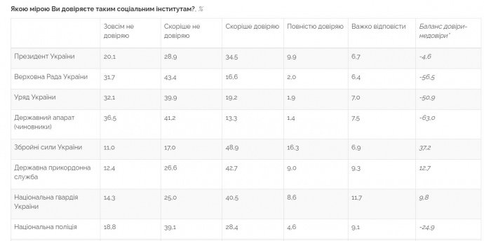 «Президенту України не довіряють 49% громадян, Верховній Раді України – 75%, Уряду України – 72%, державному апарату (чиновникам) – 78%.