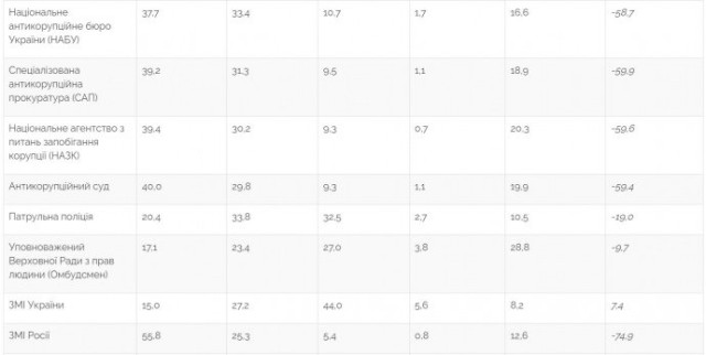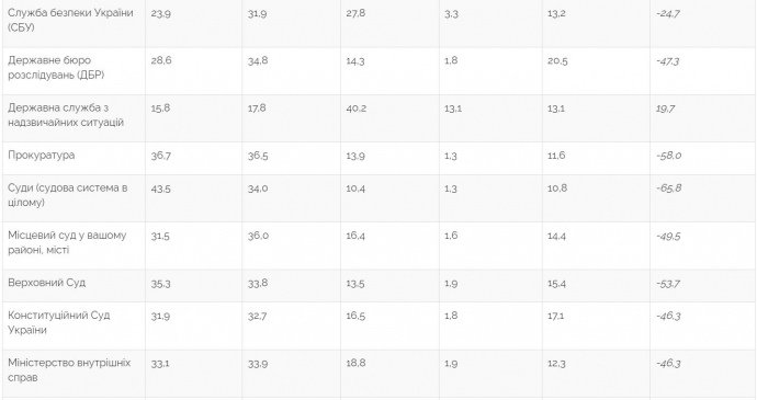 Водночас, найбільше українці довіряють Збройним силам (їм довіряють 65% опитаних), церкві (63%), волонтерським організаціям (63%), Державній службі з надзвичайних ситуацій (53%), добровольчим батальйонам (53%), Державній прикордонній службі (52%), ЗМІ України (50%), Національній гвардії (49%), громадським організаціям (47%).