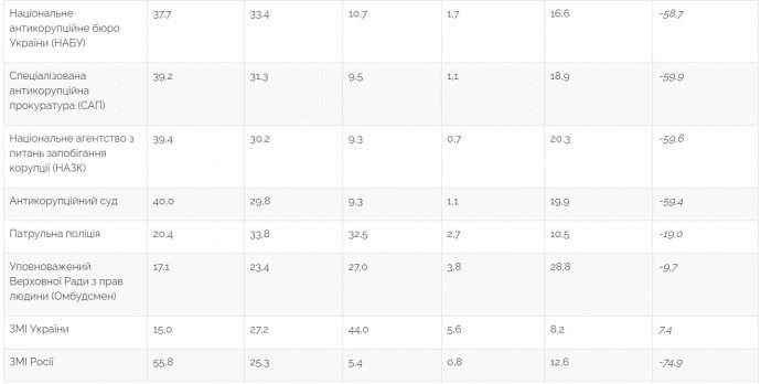 Високим є рівень недовіри до судової системи в цілому (77,5%), Верховного Суду (69%), місцевих судів (67,5%). Прокуратурі не довіряють 73% опитаних, Національному антикорупційному бюро (НАБУ) – 71%, Спеціалізованій антикорупційній прокуратурі – 70,5%, Антикорупційному суду – 70%, Національному агентству з питань запобігання корупції (НАЗК) – 70%», – йдеться у повідомленні.
