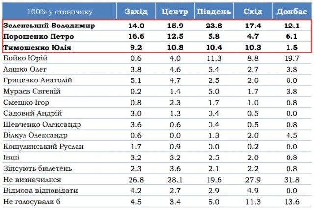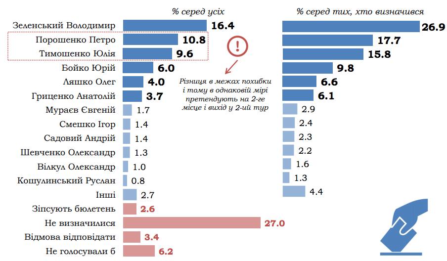 Окрім них, 9,8% готові проголосувати за Юрія Бойка, 6,6% – за Олега Ляшка, 6,1% – за Анатолія Гриценка, 2,9% – за Євгенія Мураєва, 2,4% – за Ігоря Смешка, 2,3% – за Андрія Садового, 2,2% – за Олександра Шевченка, 1,6% – за Олександра Вілкула, 1,3% – за Руслана Кошулинського, і за інших кандидатів – загалом 4,4%.При цьому, за результатами опитування, у другому турі виборів Зеленський перемагає одночасно і Порошенко, і Тимошенко.