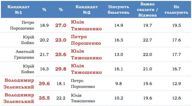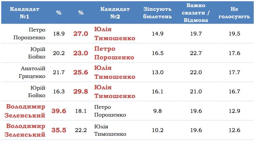 Зокрема, у парі Зеленський-Порошенко, шоумен отримує 39,6%, а чинний глава держави – 18,1%%. У цьому зв’язку 19,6% респондентів не відповіли, кого вони підтримають з цих двох кандидатів, а 12,9% відповіли, що не голосуватимуть за жодного з них. Ще 9,8% сказали, що зіпсують бюлетень.