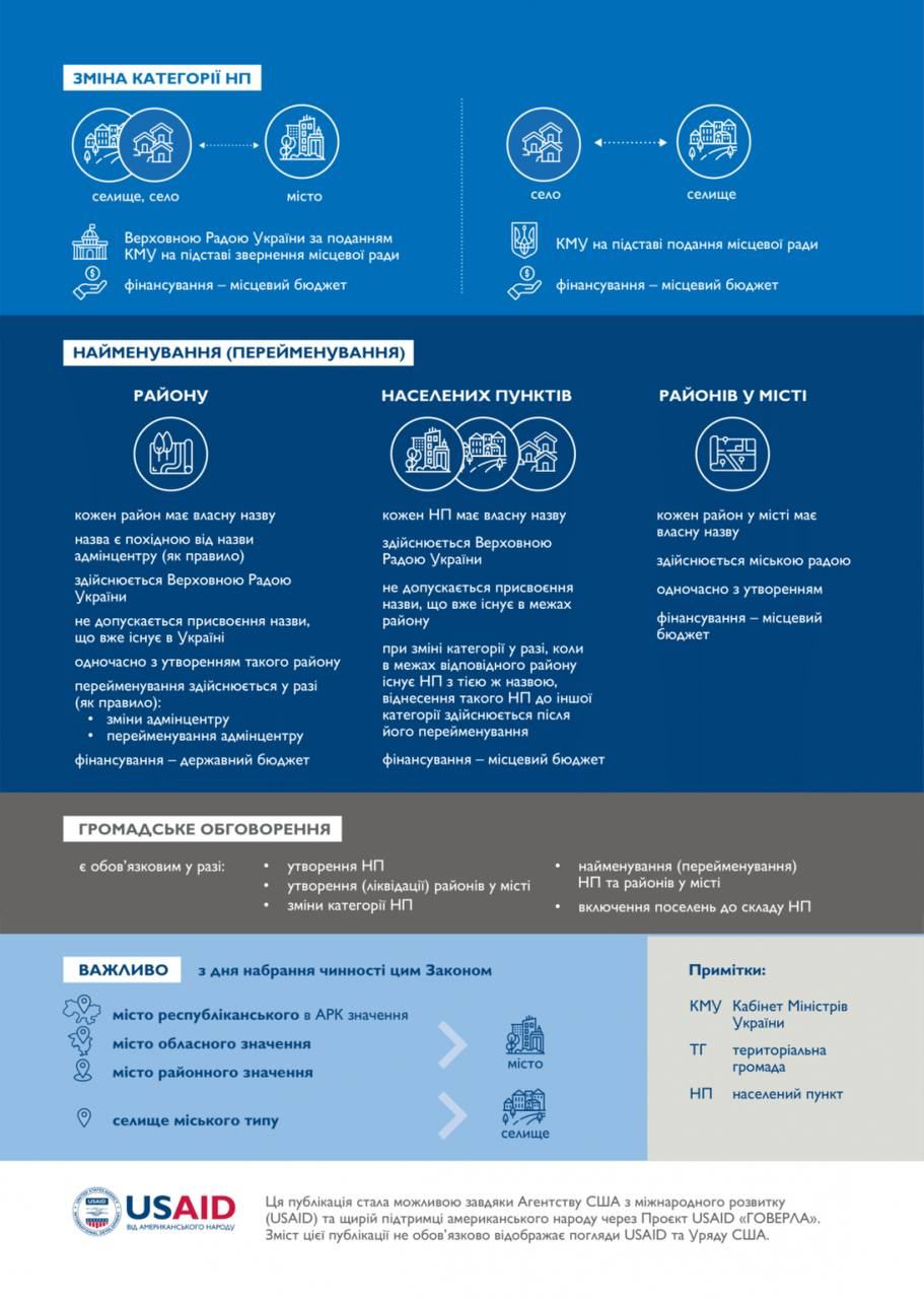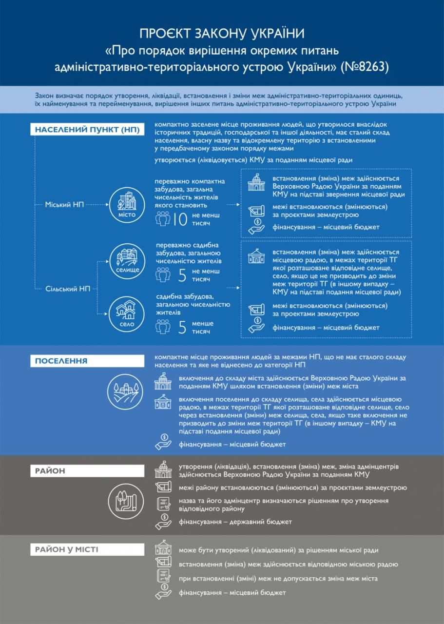 Законопроєкт пропонує прибрати чинне з 1981 року радянське регулювання питань адмінтерустрою, встановити чіткі процедури віднесення населених пунктів до категорії міст, селищ сіл, закріпити на рівні закону процедуру найменування та перейменування населених пунктів, спростити процедури встановлення меж населених пунктів тощо.