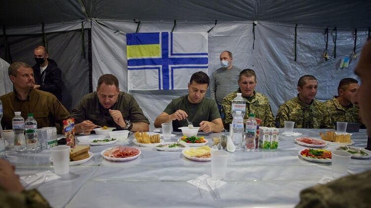 Зеленський та Єрмак пообідали на Донбасі: у військових, які сиділи поруч, не було навіть тарілок