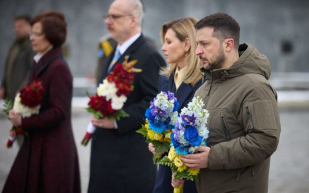Водночас у Telegram Зеленського повідомляється, що очільник держави разом з Оленою Зеленською, президентом Латвії Егілсом Левітсом і першою леді Андрою Левіте вшанували пам’ять українських полеглих героїв.