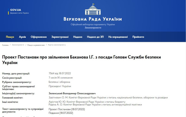 Президент України Володимир Зеленський вніс до Верховної Ради постанову про звільнення Івана Баканова з посади голови Служби безпеки України.