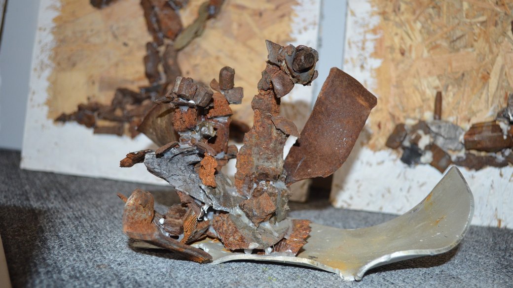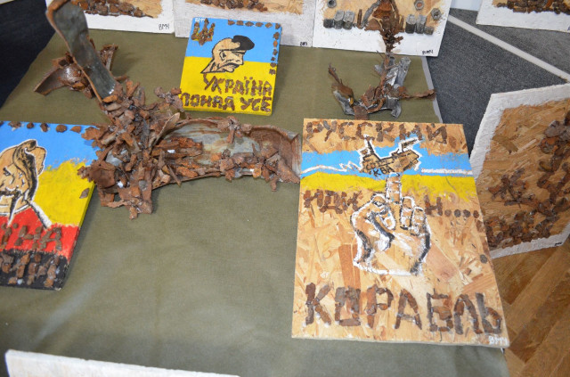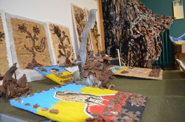 «У нас же край зелений, квітучий, але до нас прийшла війна. Я намагаюся виразити свій стан душі у своїх роботах. Хочу показати людям, чим нас росіяни «пригощають», яким залізом. Це ж уламки, які не тільки можуть поранити, покалічити, а й вбити. Вони бомблять наші хати, вбивають наших жителів. Про це мають знати всі», – каже автор робіт Василь Чайковський.Читати ще: Волиняни представили уламки російських ракет, які розмалювали діти, на виставці у Варшаві