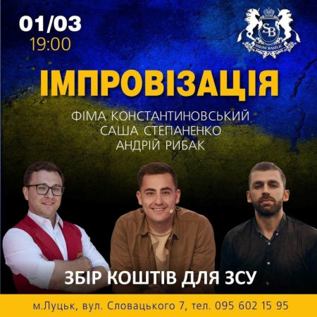 Досвідчені коміки – Фіма Константиновський, Саша Степаненко та Андрій Рибак – занурять вас у неймовірну атмосферу імпровізації та разом з вами допоможуть ЗСУ. Усі зібрані кошти будуть перераховані на потреби воїнів.