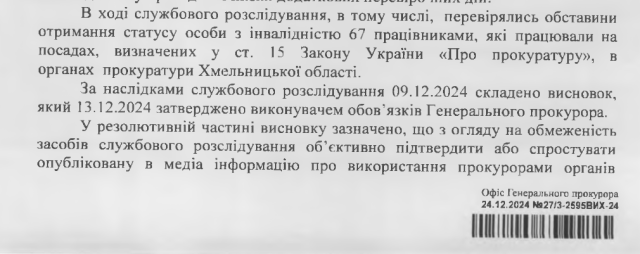 Офіс генерального прокурора в межах службового розслідування не зміг підтвердити факт неправомірного отримання інвалідності жодним із 67 прокурорів Хмельницької прокуратури. Тож їх не звільнили.