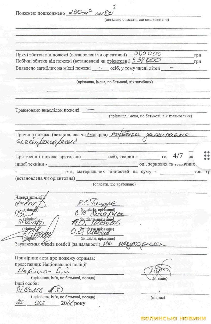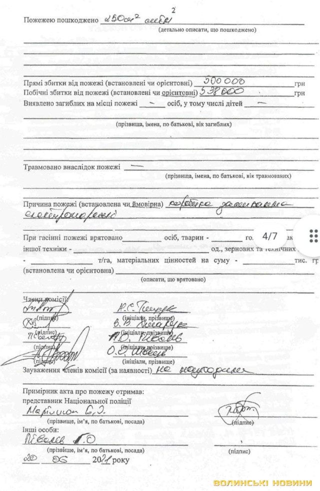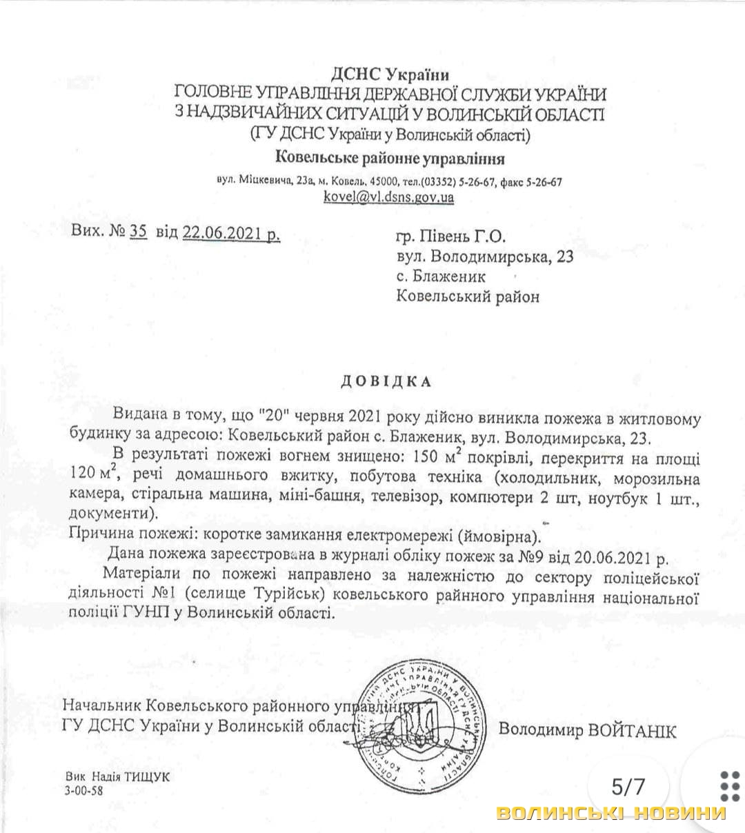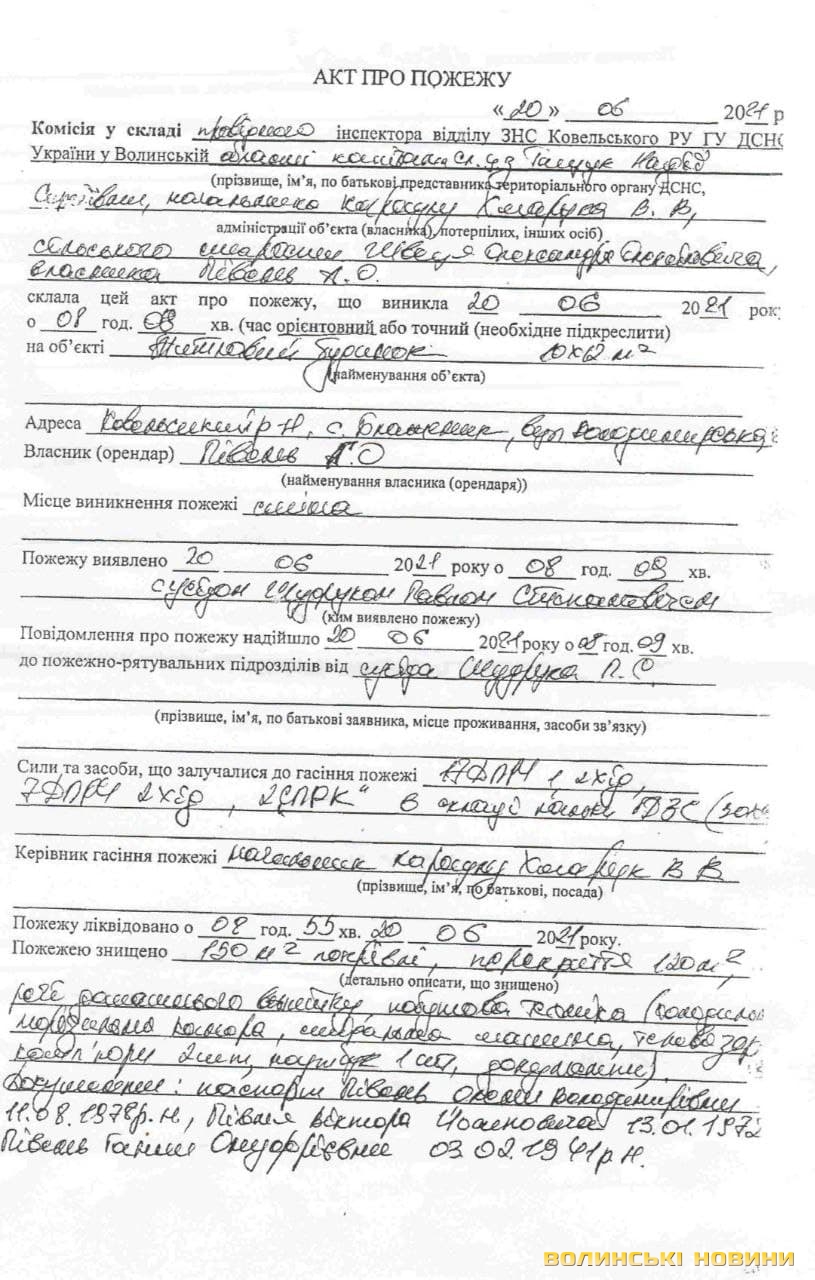 «Зранку 22 червня 2021 року на Кирилів день (релігійне свято у православних християн, – ВН) я пішла на роботу, залишивши у хаті двох малолітніх доньок – 7-річну Валерію, 14-річну Вікторію та стареньку матір чоловіка Віктора. Він (чоловік, – ВН) завіз мене на роботу і повернувся додому, аби вивести корову на пасовисько. Разом з корівкою відійшов приблизно 400 метрів, бачить – хата горить! Прибігли сусіди, почали гасити пожежу. А вогонь вже й перекинувся на шифер. Тим часом чоловік побіг у палаючу хату, і вивів дітей, а тоді їхню бабусю», – схлипує багатодітна мати, відтворюючи страшні події двомісячної давнини.Викликали пожежників. Прибуло два екіпажі – один з Турійська, а інший – з Володимира-Волинського. Утім, аби загасити вогнище, води, залитої в резервуари спецтранспорту рятувальників, на жаль не вистачило.