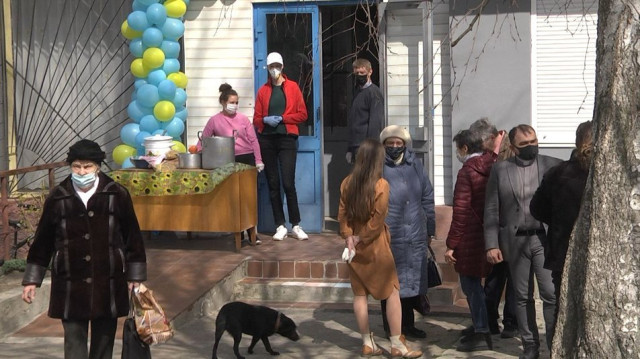 Їжу нужденним почали роздавати 12 квітня о 12:00. «Український борщ з перцем болгарським, помідорами, морквою, капустою, все самі виростили. Також є бурячок із цибулькою, салат, сосиски і вермішель з маслом», – перелічує меню волонтерка Ірина Угринович.