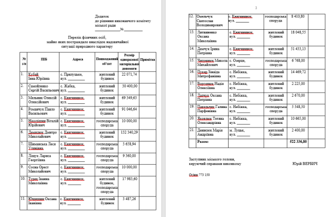 На розгляд членів виконкому винесли питання про надання одноразової матеріальної допомоги населенню, майно якого постраждало внаслідок надзвичайної ситуації природного характеру.