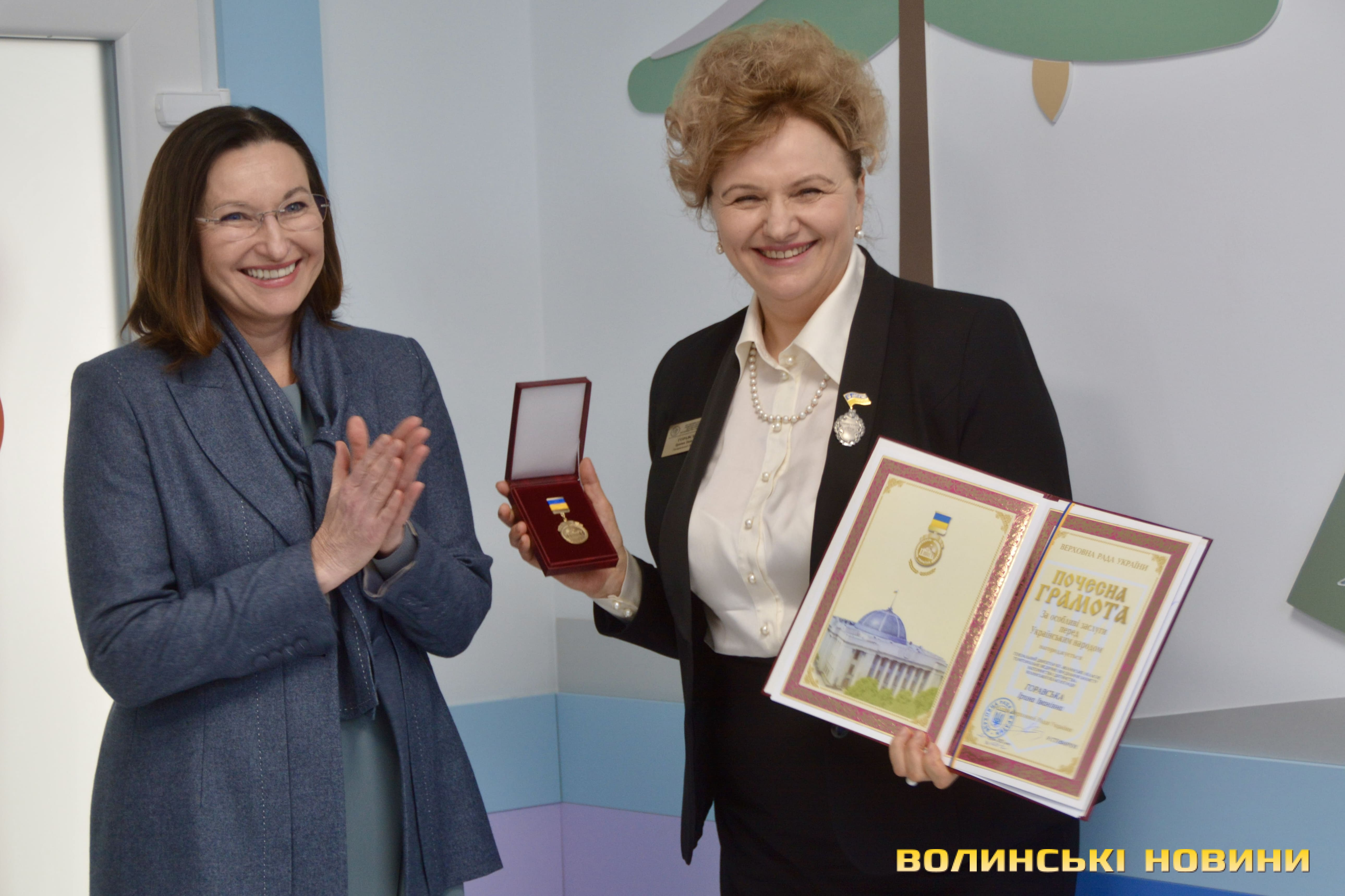 Ірина Констанкевич за нагоди вручила генеральній директорці Ірині Горавській Почесну грамоту Верховної Ради України – за особливі заслуги перед українським народом.Нагадаємо, навесні 2025 року у Волинській обласній дитячій лікарні відкрили оновлене відділення онкогематології.