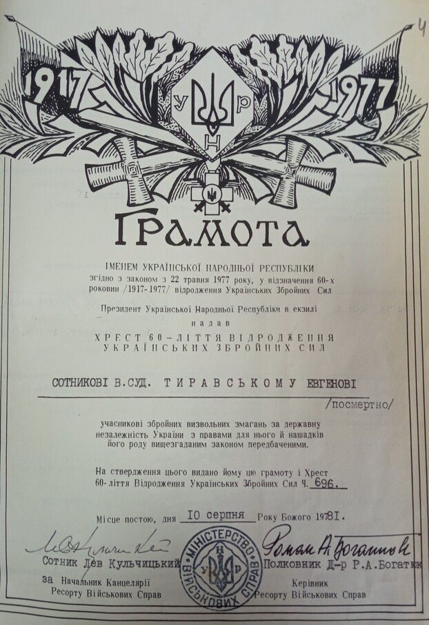 Станом на 1945 рік Євген Тиравський з дружиною проживали у місті Кітцінґен, згодом переїхали до Весбадена, де ексголова Луцька працював у бібліотеці табору. Опинившись за кордоном, він намагався бути у центрі українського еміграційного життя, входив до Союзу українських ветеранів, долучався до церковних справ, більше того, йому пропонували стати адміністратором УАПЦ у британській зоні окупації Німеччини, однак він відмовився. Одна з причин могла бути пов’язана з дозволом на еміграцію до Австралії, який родина отримала 19 квітня 1949 року.Фото з документа про виїзд до Австралії. Євген і Ольга Тиравські, 1949 р.