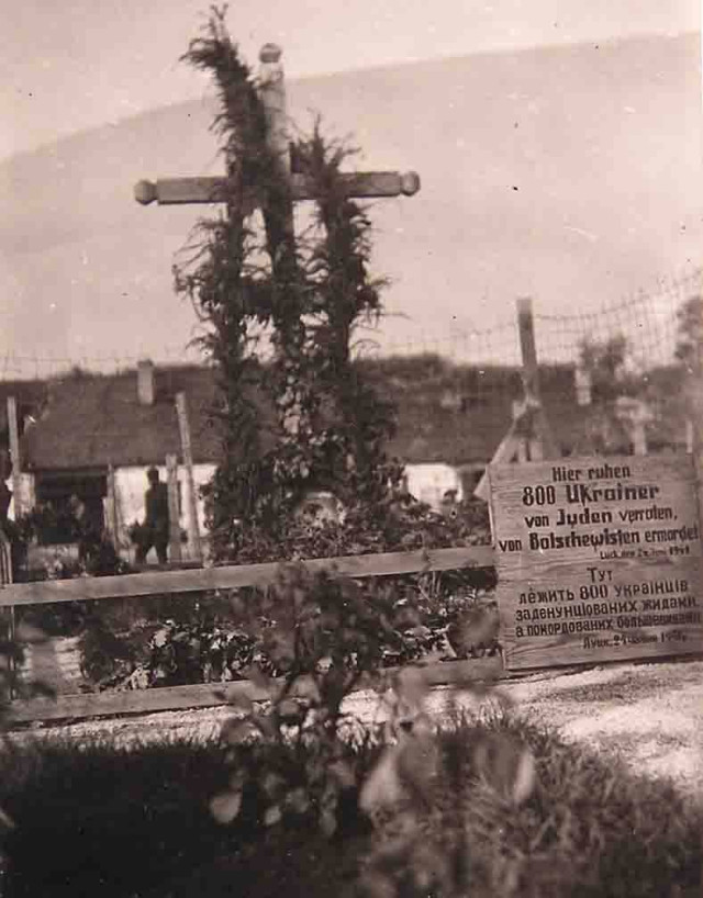 Про трагедію євреїв Євген Тиравський міг довідатися і постфактум. На той час всі страждали через зруйновані будинки, де під завалами були тіла людей, до того ж, місто шокувала страта в’язнів у Луцькій тюрмі. Навіть на могилах луцьких в’язнів було встановлено таблички з написами: «Тут лежить 800 українців, заденунціованих жидами, а помордованих большевиками. Луцк, 24 червня 1941 р.».Одна з могил в’язнів луцької тюрми. Напис на табличці німецькою та українською: «Тут лежить 800 українців, заденунціованих жидами, а помордованих большевиками. Луцк, 24 червня 1941 р.»