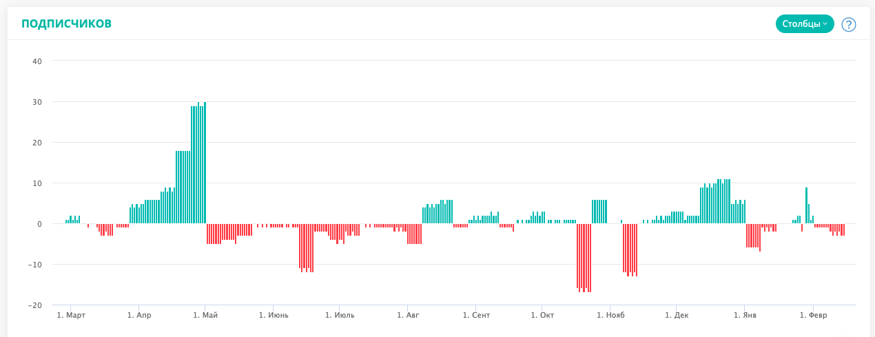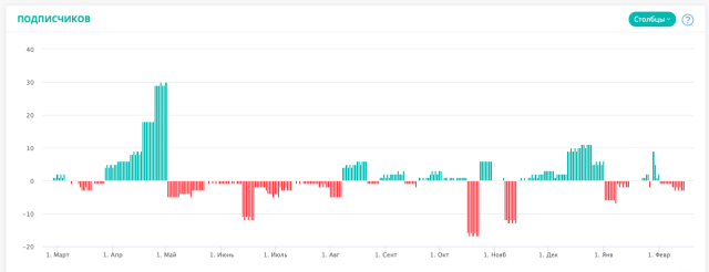 «Уперше вона намагалася стати сексуальним просвітителем серед підлітків, потім перейшла до тем про бізнес, свій заробіток, розповідала про вебінари і проводила безплатні прямі ефіри. Тоді вона нічого не розігрувала. На графіку цей період явно виділяється – практично немає підписок (зелені стовпці) і досить багато відписок, порівняно із іншими періодами (червоні стовпці)», – пояснює показники інтернет-маркетолог.