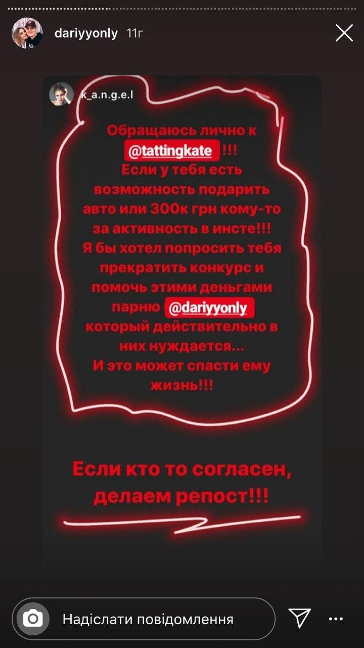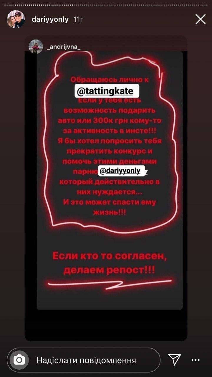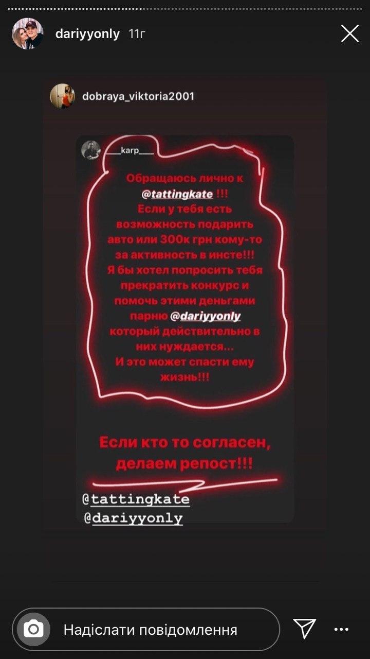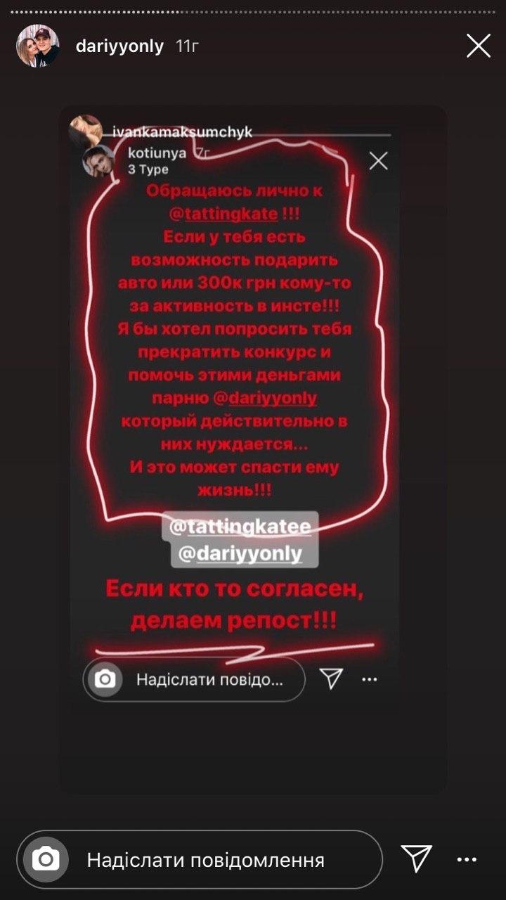 Дарій розповів, що одного разу, коли Катерина зі своїм хлопцем Дмитром гуляла у ТРЦ «ПортСіті», він, упізнавши відому блогерку, підійшов до неї і попросив репостнути інформацію про нього на сторінці в Instagram.