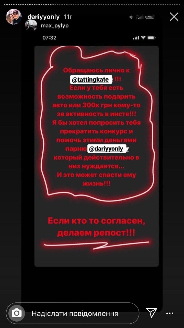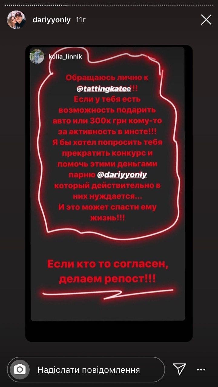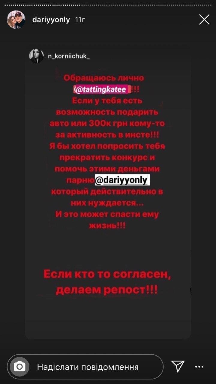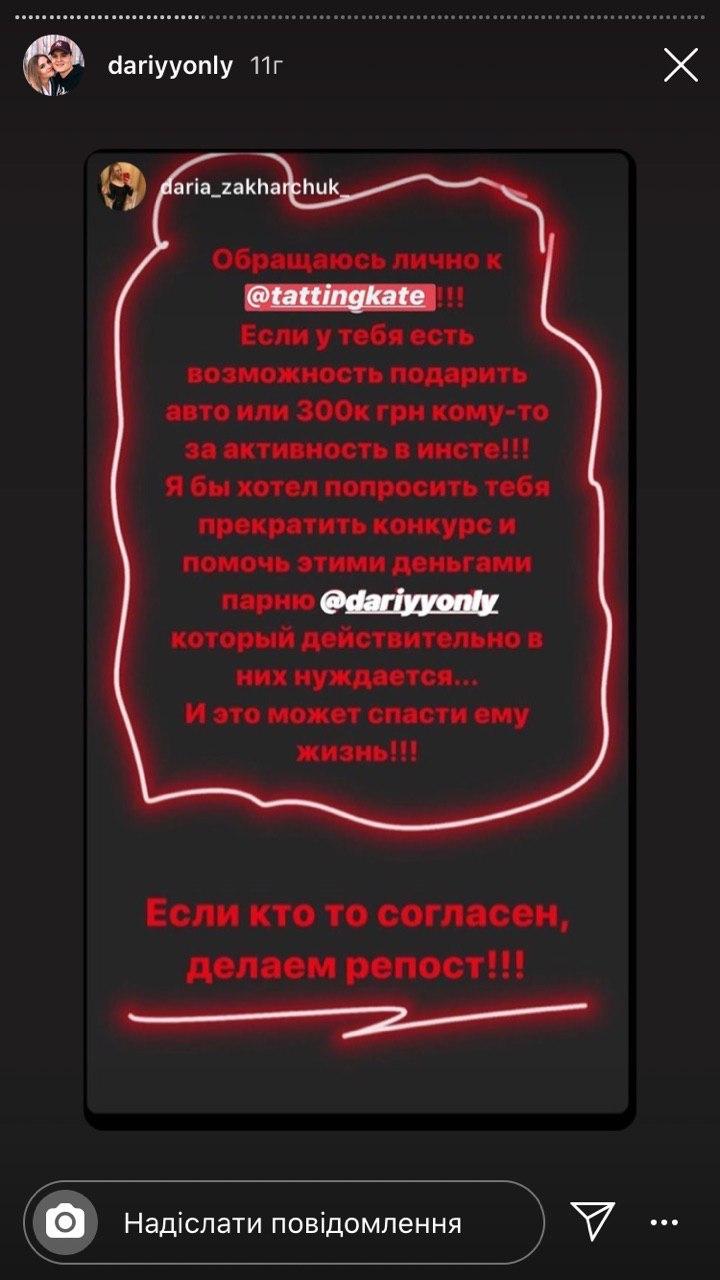 Дарій розповів, що одного разу, коли Катерина зі своїм хлопцем Дмитром гуляла у ТРЦ «ПортСіті», він, упізнавши відому блогерку, підійшов до неї і попросив репостнути інформацію про нього на сторінці в Instagram.
