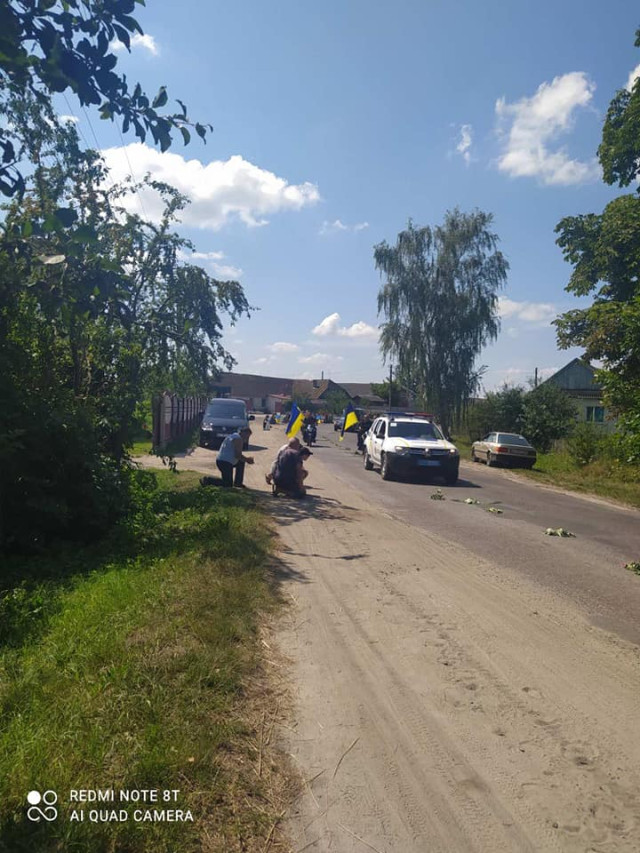 У рідній громаді полеглого воїна зустріли живим коридором слави, у супроводі «Плине кача», встеливши його останній шлях квітами.