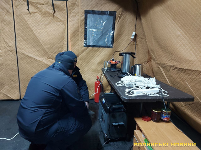 «Працюємо тут позмінно 24/7», – усміхаються рятувальники та проводять техогляд генераторів і теплових пушок: готуються приймати містян, які зазвичай приходять сюди, коли вимикають електрику, щоб підзарядити гаджети.У наметі – тепло. Є чиста вода, чайники, щоб заварити чаю чи кави, смаколики й навіть кілька баночок варення. Тут достатньо стільців, пледів. Для дітлахів завбачливо приготували чимало іграшок та розмальовок.«Маємо достатньо подовжувачів, щоб можна було заряджати одночасно 50 телефонів. Також можна скористатися безплатним WI-FI», – розповідає рятувальник, сержант служби цивільного захисту Володимир Кухарчук.Читати ще: У зв'язку з погодою у Волинській області відкрили пункти незламності