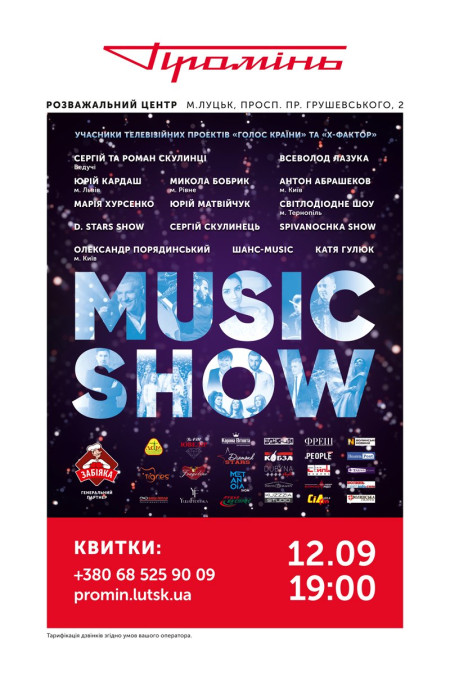 12 вересня у РЦ «Промінь» відбудеться концерт «MUSIC SHOW», учасниками якого стануть зірки «X-ФАКТОР» та «ГОЛОС КРАЇНИ»: Марія Хурсенко, Сергій Скулинець, Юрій Матвійчук, Всеволод Лазука, Юрій Кардаш, Микола Бобрик, Антон Абрашеков, Олександр Порядинський, Катя Гулюк.