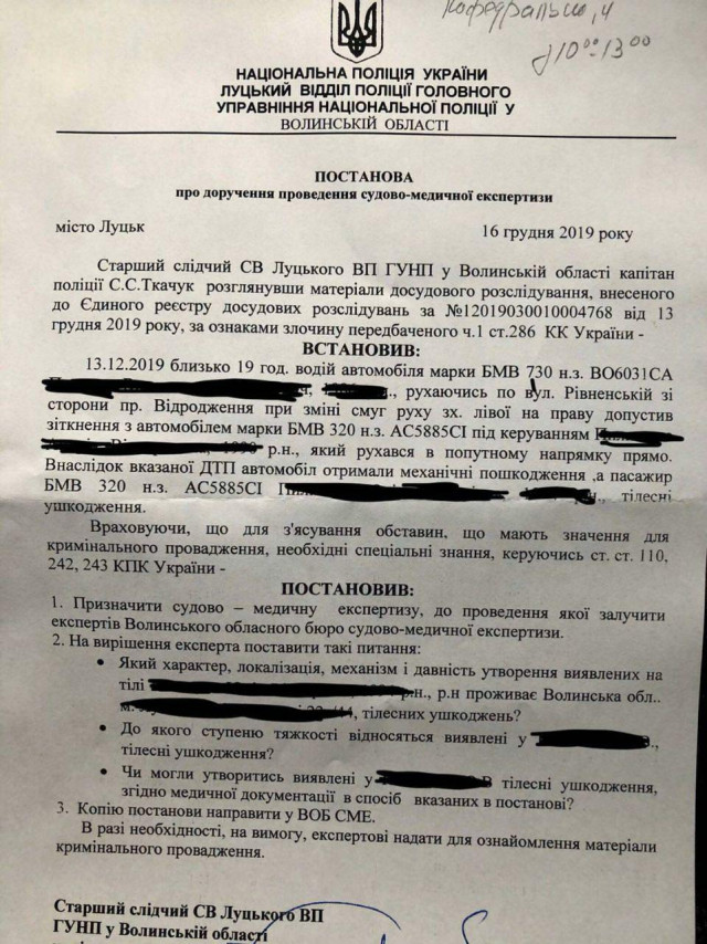 «13 грудня о 19:00 годині у Луцьку по вулиці Рівненській зіткнулися два автомобіля BMW. За кермом транспортних засобів перебували 33-річний та 29-річний водії. Обидва мешканці Луцька. Автомобілі рухалися у попутному напрямку. Внаслідок ДТП постраждала 25-річна пасажирка BMW 320. Обидва водії не перебували у стані алкогольного сп’яніння. За фактом порушення правил безпеки дорожнього руху, що стало причиною отримання тілесних ушкоджень потерпілою, слідчі луцького відділку поліції розпочали кримінальне провадження за ч. 1 статті 286 ККУ. Встановлюють обставини ДТП», - зазначив головний речник ГУНП у Волинській області Віктор Гомоль.