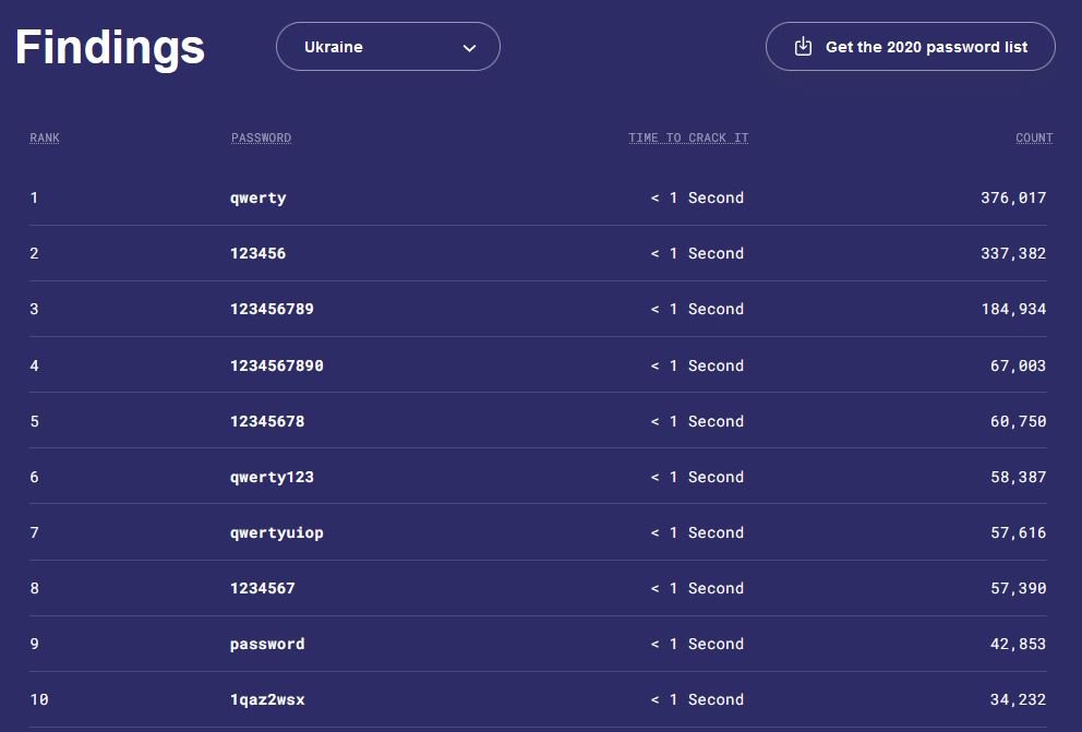 В Україні у ТОП-10 популярних паролів увійшли: qwerty, 123456, 123456789, 1234567890, 12345678, qwerty123, qwertyuiop, 1234567, password та 1qaz2wsx.Попереджається, що всі перелічені паролі можна зламати за 1 секунду.