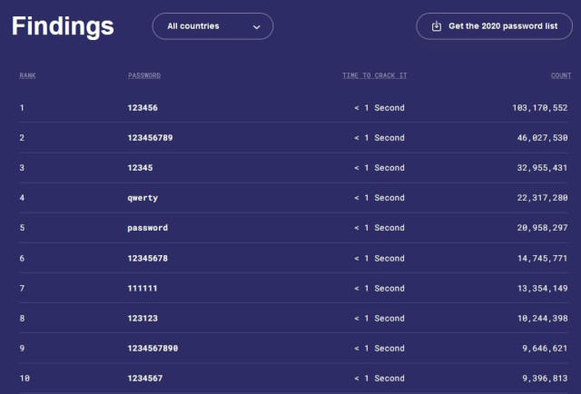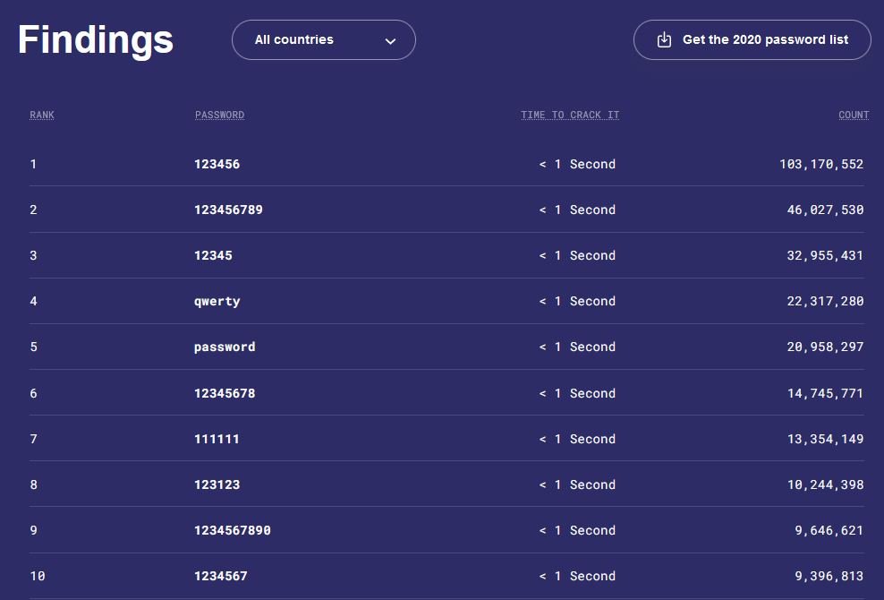 За даними компанії, до найбільш популярної десятки паролів у світі увійшли – 123456, 123456789, 12345, qwerty, password, 12345678, 111111, 123123, 1234567890 та 1234567.Експерти рекомендують користувачам змінювати паролі своїх аккаунтів кожні 90 днів.