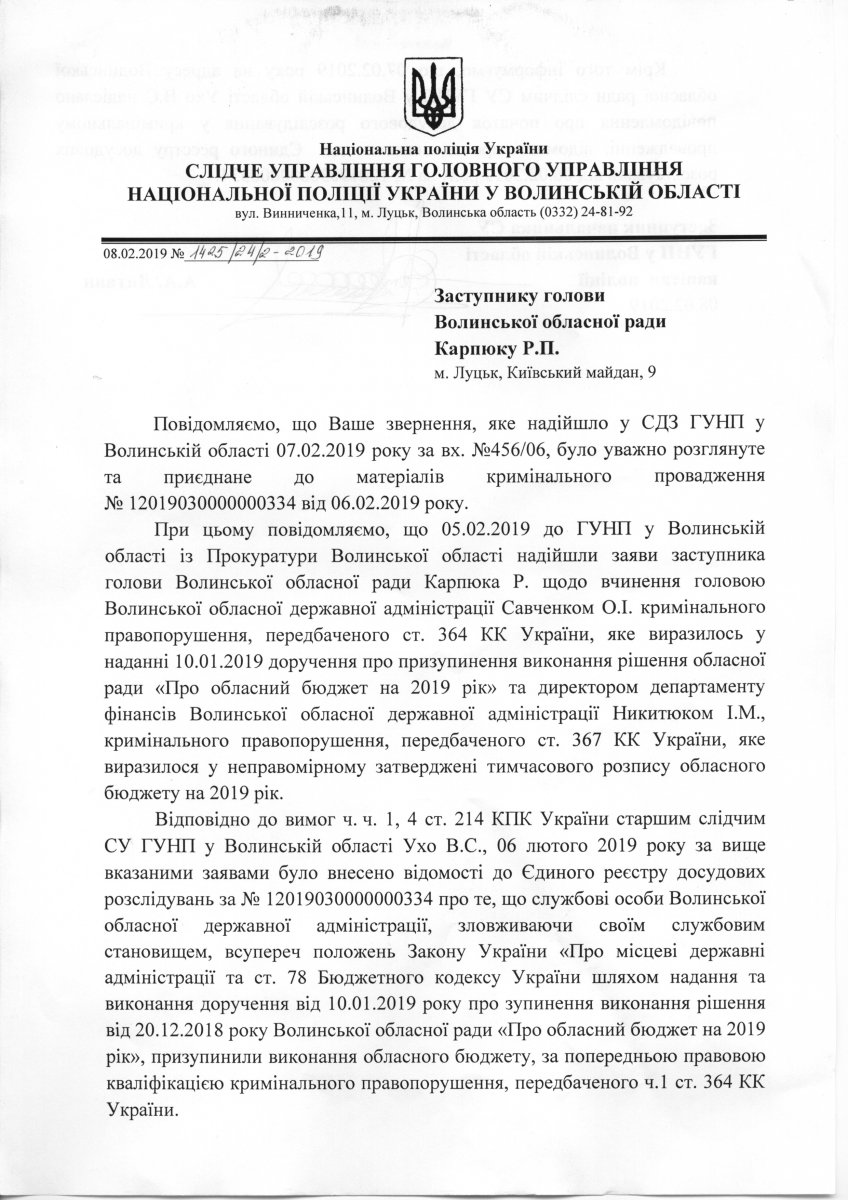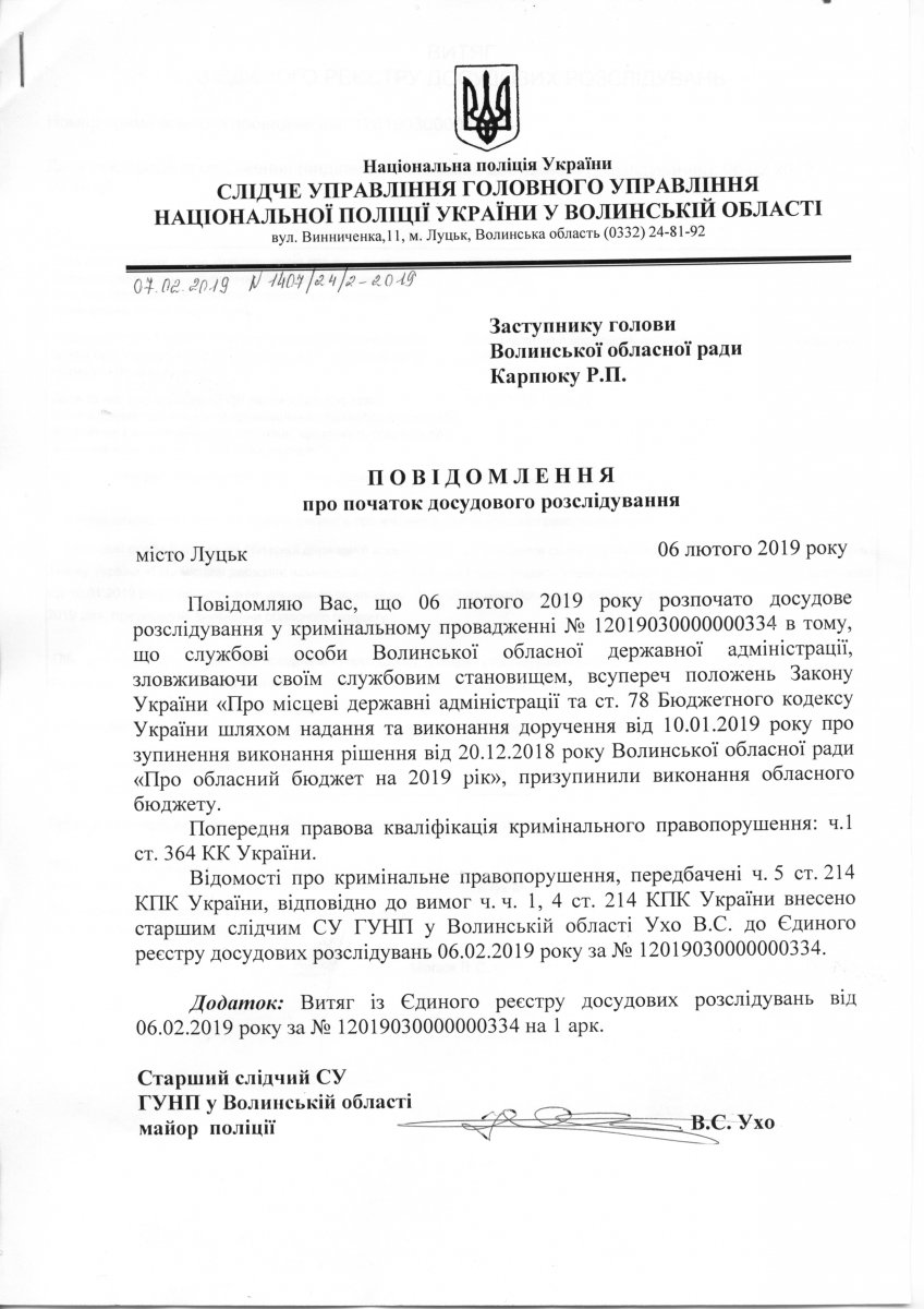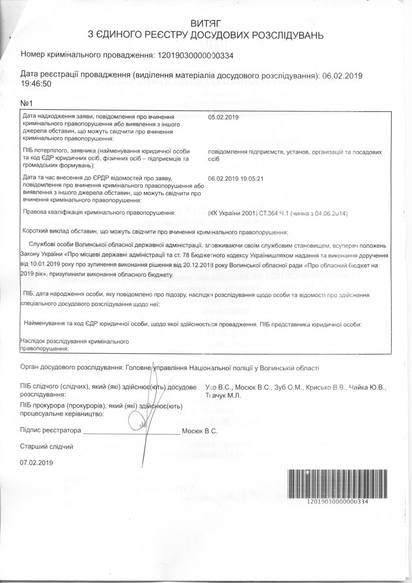 «Відповідно до вимог ч. ч. 1, 4 ст. 214 КПК України старшим слідчим СУ ГУНП у Волинській області Ухо В.С., 06 лютого 2019 року за вище вказаними заявами було внесено відомості до Єдиного реєстру досудових розслідувань за № 12019030000000334 про те, що службові особи Волинської обласної державної адміністрації, зловживаючи своїм службовим становищем, всупереч положень Закону України «Про місцеві державні адміністрації та ст. 78 Бюджетного кодексу України шляхом надання та виконання доручення від 10.01.2019 року про зупинення виконання рішення від 20.12.2018 року Волинської обласної ради «Про обласний бюджет на 2019 рік», призупинили виконання обласного бюджету, за попередньою правовою кваліфікацією кримінального правопорушення, передбаченого ч.І ст. 364 КК України.