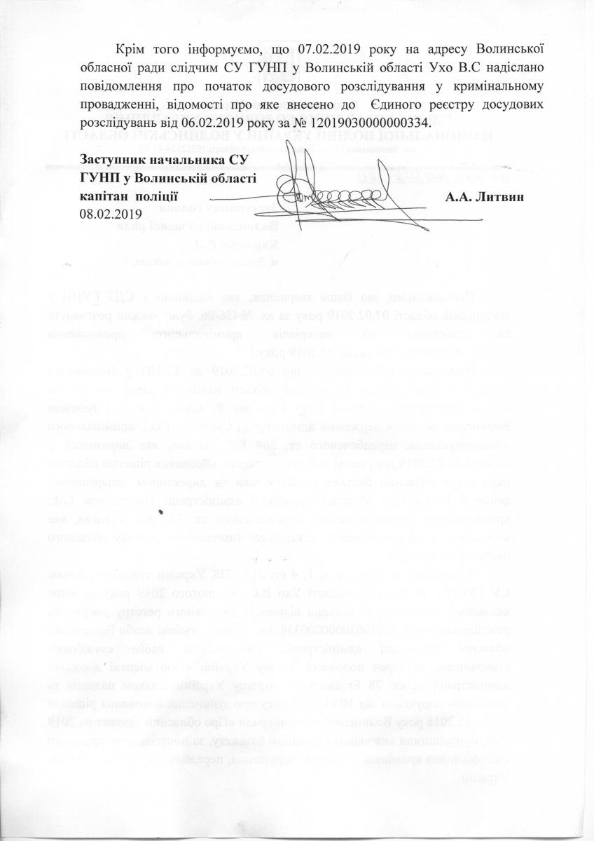 Крім того інформуємо, що 07.02.2019 року на адресу Волинської обласної ради слідчим СУ ГУНП у Волинській області Ухо В.С. надіслано повідомлення про початок досудового розслідування у кримінальному провадженні, відомості про яке внесено до Єдиного реєстру досудових розслідувань від 06.02.2019 року за № 12019030000000334», – йдеться у повідомленні заступника начальника СУ ГУНП у Волинській області, капітана поліції А.А. Литвина.