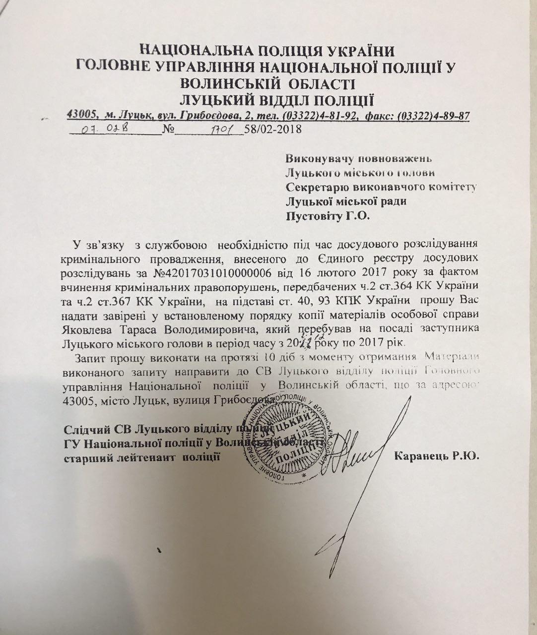 «Під час досудового розслідування кримінального провадження від 16 лютого 2017 року за фактом вчинення кримінальних правопорушень, передбачених ч. 2 ст. 364 КК України та ч. 2 ст. 367 КК України, на підставі ст. 40, 93 прошу Вас надати завірені у встановленому порядку копії матеріалів особової справи Яковлева Тараса Володимировича, який перебував на посаді заступника Луцького міського голови в період часу з 2012 року по 2017 рік», – йдеться у зверненні поліції до виконувача повноважень міського голови Григорія Пустовіта.Статті, за якими поліція здійснює розслідування щодо Яковлева, це «Зловживання владою або службовим становищем, спричинили тяжкі наслідки» та «Службова недбалість».